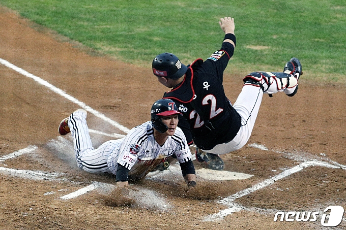 9회 초 2사 만루에서 lg 2루 주자 오지환이 홍창기의 적시타 때 홈으로 뛰어들어 추가득점을 올리고 있다.